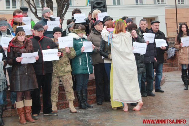 Також символічною Україною була дівчина в українському одязі та з закривавленим обличчям, вона стояла босоніж, при мінусовій температурі.