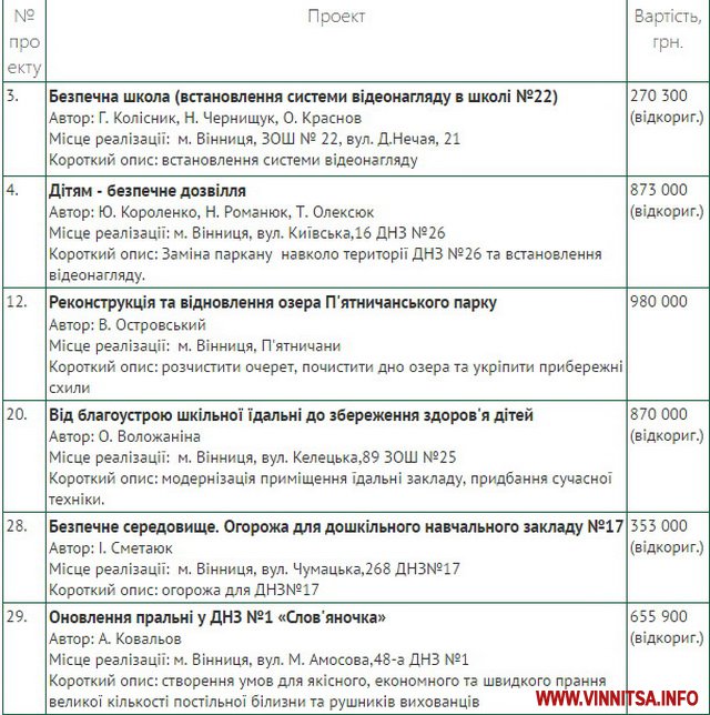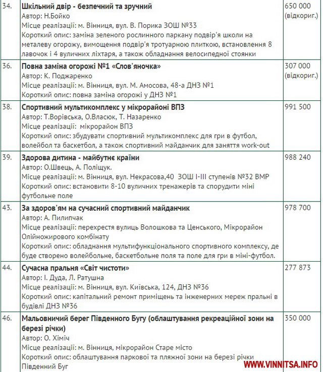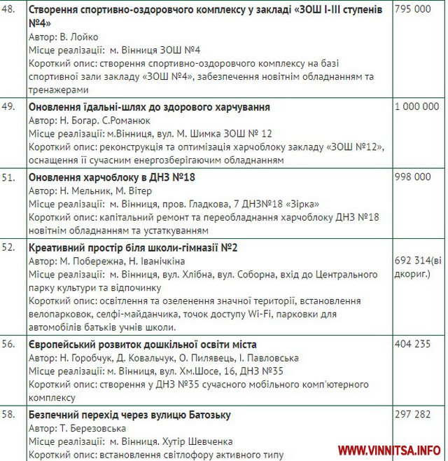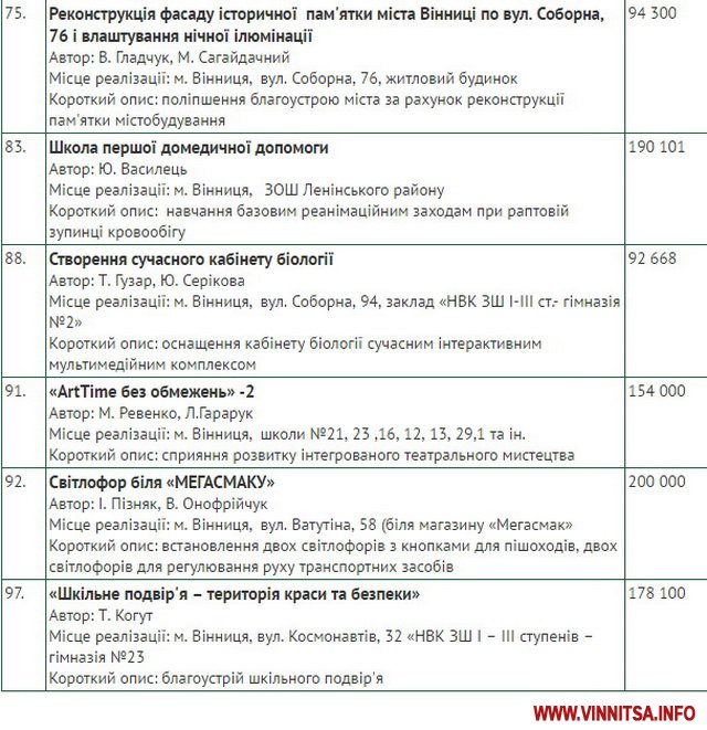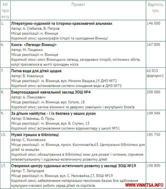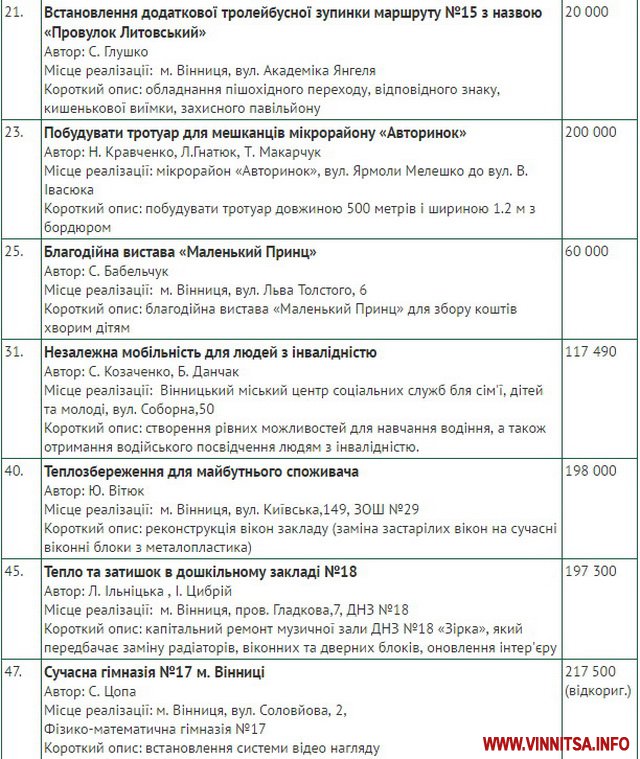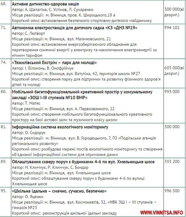 У Вінниці в рамках Бюджету громадських ініціатив було подано 97великих та малих проектів. З них відібрали для голосування 59 проектів, які будуть реалізовані в 2017 році. Це 32 великих та 27 малих проектів. Голосування розпочинається 1 жовтня.