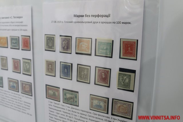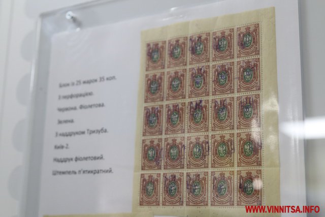 Серед екземплярів є марка «Проголошення Незалежності Карпатської України 15 березня 1939»; поштові марки Західно-Української Народної Республіки; марки Російської імперії, але гашені українським тризубом; марка Гомеля, який на той час був частиною України. Є марка з Ростова-на-Дону, теж погашена тризубом.