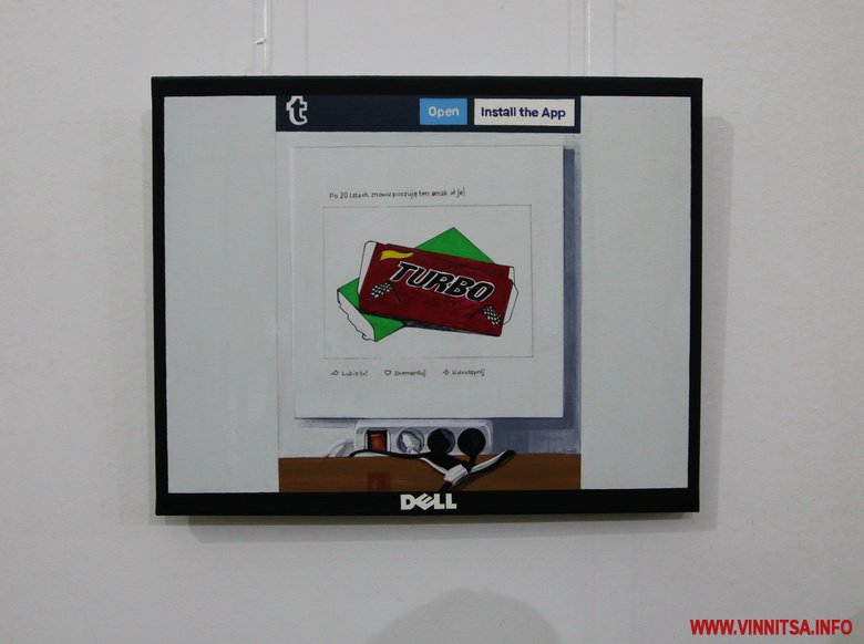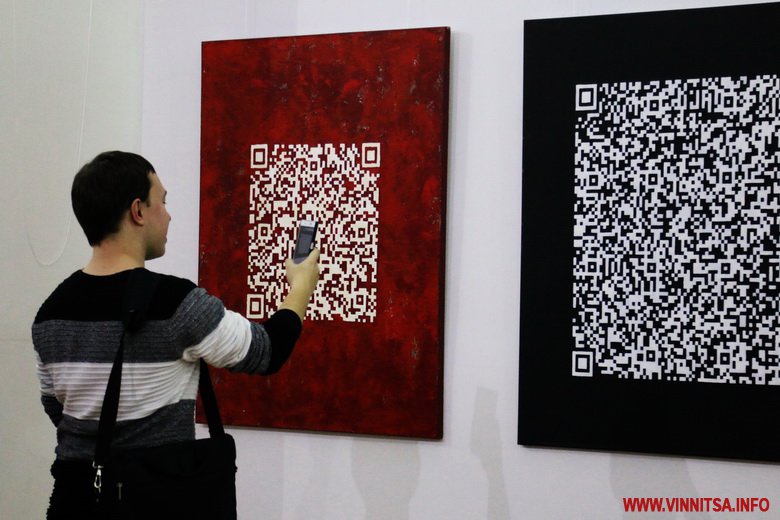 На виставці представлені картини, де зображено комп’ютерні принтскріни, фрагменти діалогів із чатів та картини, де зображені QR-коди.