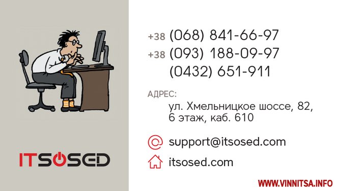 Компанія IT SOSED, розташована у приміщенні заводу “Аналог”, що за адресою Хмельницьке шосе, 82, приймає замовлення громадян у будні за телефоном, а також електронною поштою. Кожен, хто раптово виявив несправності у роботі свого комп'ютера, ноутбука або планшета, може зручно та швидко викликати професійного майстра на дім для отримання термінової допомоги у ремонті техніки.