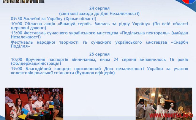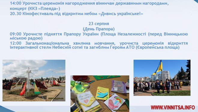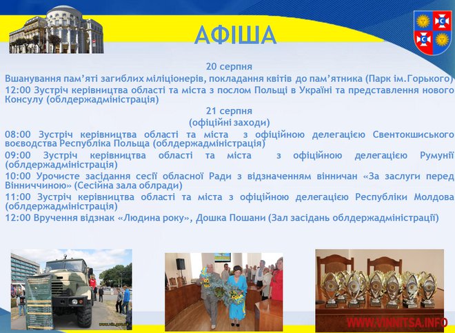 За його ловами, офіційні заходи у Вінниці та області заплановані на 20, 21, 23, 24 та 25 серпня.