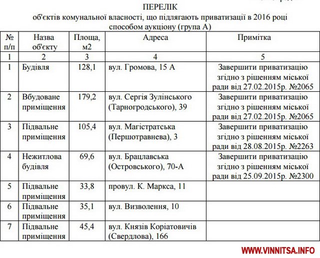 Виконавчий комітет Вінницької міської ради підготував до сесії проект рішення «Про затвердження переліків об’єктів комунальної власності, що підлягають приватизації в 2016 році».
