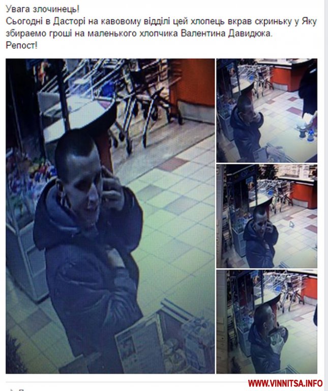 «Сьогоднi в «Дасторi» на кавовому вiддiлi цей хлопець вкрав скриньку у яку збираємо грошi на маленького хлопчика Валентина Давидюка», - йдеться у соцмережі.