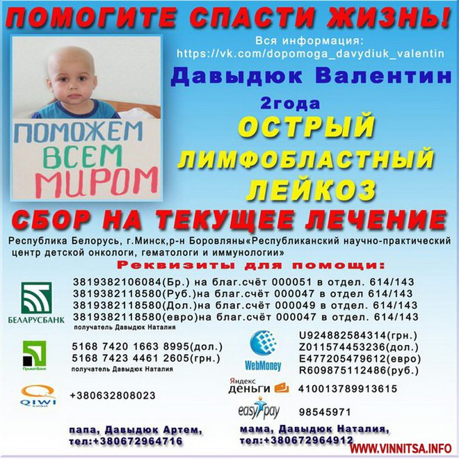 На щастя, коштів там було не багато – 150-200 гривень, проте для сім’ї Давидюків дорога кожна копійка. Адже у 2-річного Валентина – гострий лімфобастний лейкоз, лікувати який планують в Білорусі. Щоб побороти недуг, батькам потрібно зібрати 5 825$.