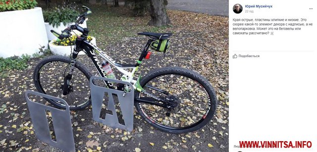 «Краї гострі, пластини хиткі і низькі. Це, швидше, якийсь елемент декору з написом, а не велопарковка. Може, це на біговел або самокати розраховано?», - пише у «Фейсбук» Юрій Мусійчук, додаючи власне фото.