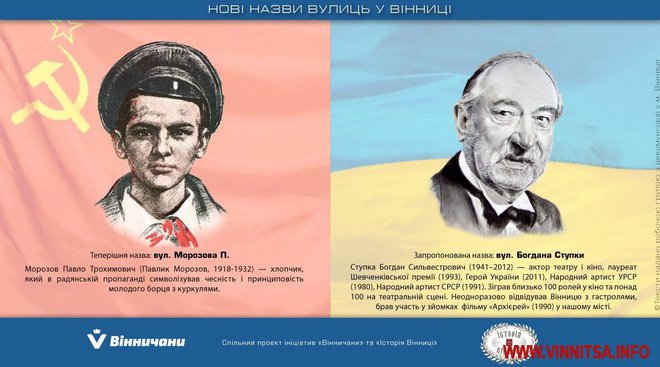 Так, вулицю Морозова планують назвати імені Богдана Ступки – актора театру і кіно, який неодноразово відвідував Вінницю.