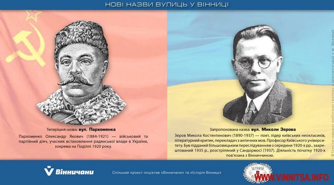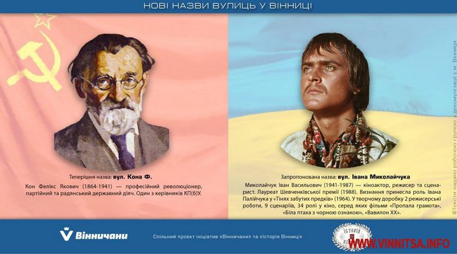 Фахівці вже підготували візуальне пояснення можливих нових адрес. Раніше ми писали, як і чому перейменують вулиці 12 грудня, Волочаївську і Володарського, де і чому у Вінниці з’являться вулиці Курбаса, Івасюка і Свидницького, вулицю Блюхера планують змінити на Малохуторянську, Жукова – на Генерала Дерев’янка, а Квятека на Костянтина Могилка. Вулиці Фурманова пропонують назвати вул.. Юрія Клена, Щорса - Костя Широцького, В. Чубаря - Марцелія Високінського, про перейменування вулиць Фрунзе і Свердлова та як змінять назви вулиці Уборевича, Фадєєва і Куйбишева, Карла Маркса і Чкалова, 30,40,50-річчя Перемоги. Михайличенка, Конєва і Енгельса змінять назви.