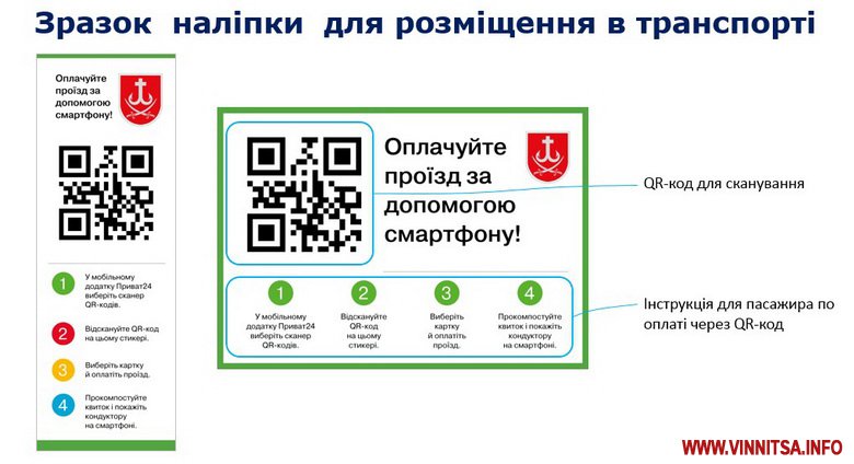 З 22 січня у транспорті КП «Вінницької транспортної компанії» з’являться наліпки з QR-кодом, які дозволяють пасажирам платити за проїзд, не використовуючи готівку. У кожному тролейбусі, трамваї та автобусі буде по три наліпки, щоб пасажирам було зручно розраховуватись.