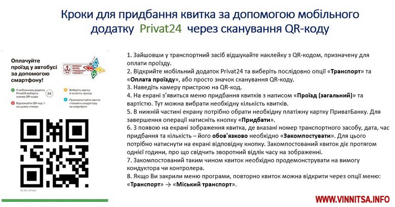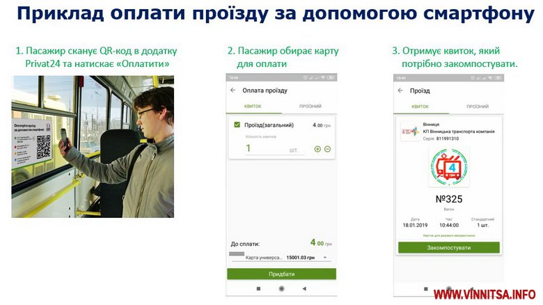 Як розповів директор Вінницької транспортної компанії Михайло Луценко, безконтактна оплата проїзду в громадському транспорті не потребує багато часу та зусиль. Потрібно підійти до наліпки з кодом. Відкрити на мобільному пристрої додаток Privat24. Обрати позначку «Транспорт», після чого – позначку «Оплата проїзду». Розпочинається сканування коду: потрібно тримати пристрій так, щоб код був у рамці, яка з’явиться на екрані.