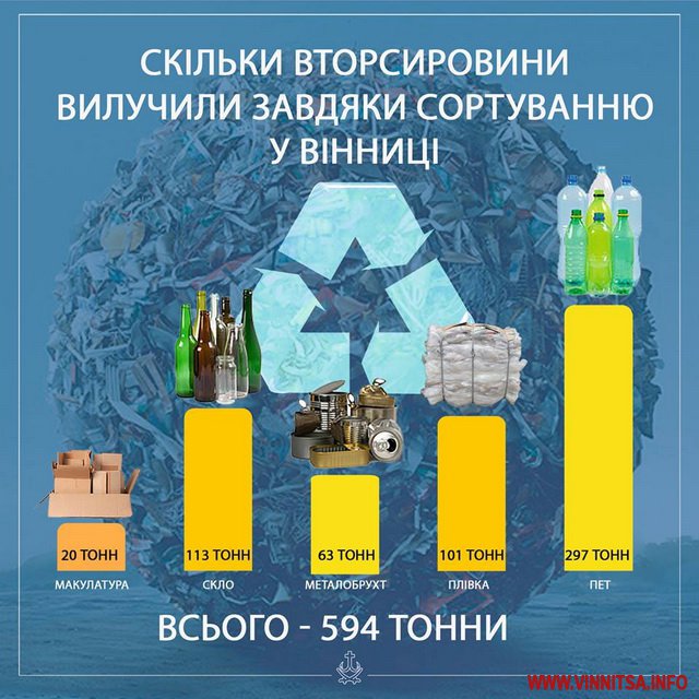 У Вінниці з літа 2015 року почали впроваджувати пілотний проект з роздільного збору сміття. За час реалізації проекту, вдалося вилучити майже 600 тонн вторсировини, яка пішла безпосередньо на переробку.