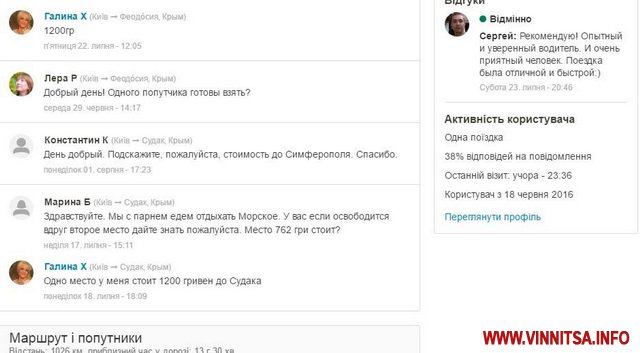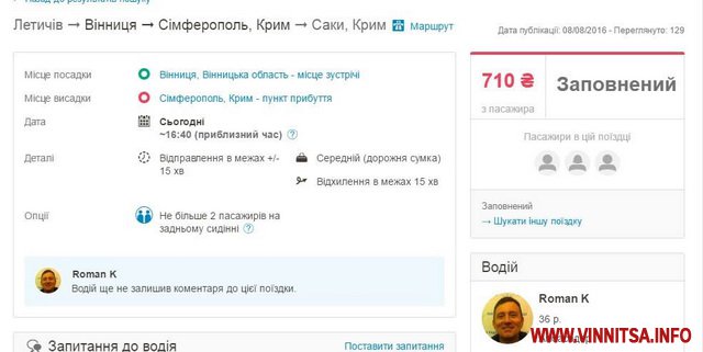 Зокрема на ресурсі BlaBlaCar. з пошуку пасажирів та «попуток» оголошення про те, що водії готові взяти з собою вінничан у різні куточки Криму.