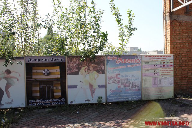 Близько десятка робітників активно розбирають колишню льодову ковзанку, вже зняли вивіску, двері, розібрали сам купол, де був лід та цегляні стіни в стадії руйнування. Про те що на цьому місці був колись один з найкращих льодових клубів свідчать тільки старі фото та вивіски біля колишнього входу.