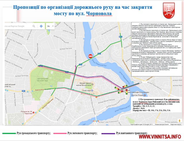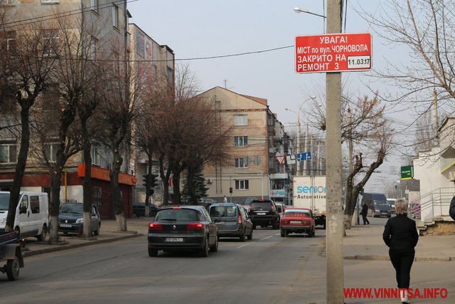 11 березня до листопада 2017 року у Вінниці на капремонт закривають міст через річку Південний Буг по вулиці Чорновола. По мосту рухатиметься лише громадський транспорт – тролейбуси, автобуси та маршрутні таксі. Рух легкового транспорту буде здійснюватися через вулицю Соборну, а вантажівки пустять по вулицям Магістратській (колишня Першотравнева) та Князів Коріатовичів (колишня Свердлова).