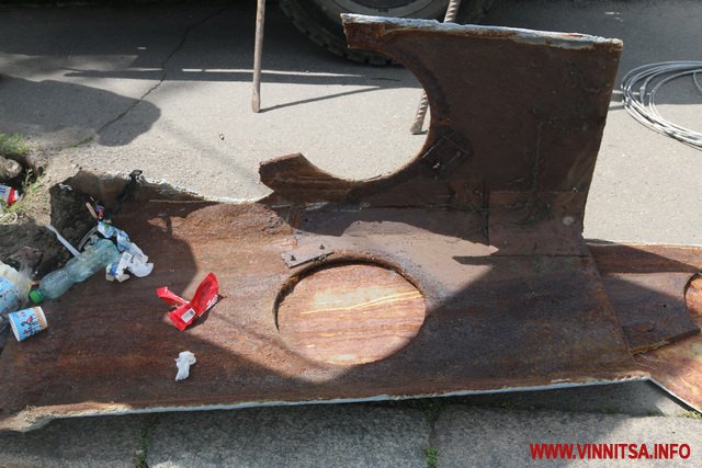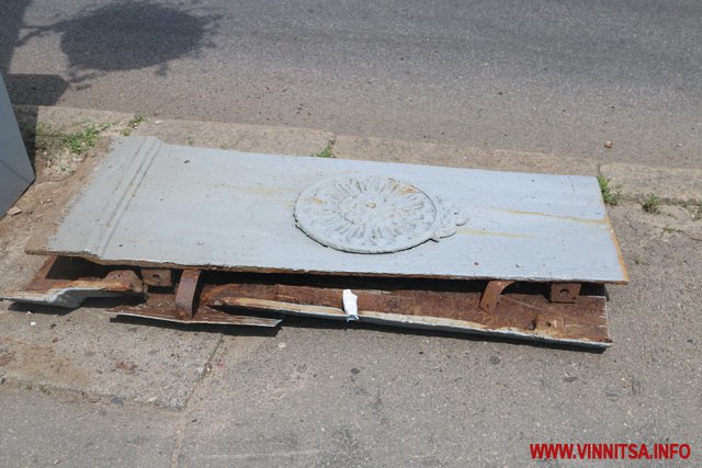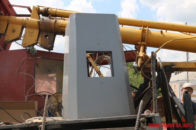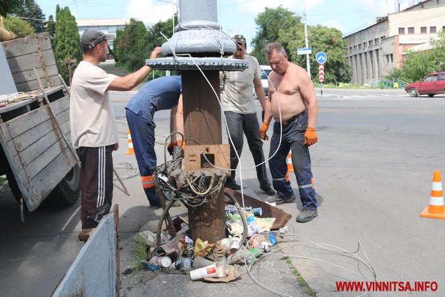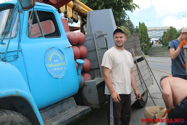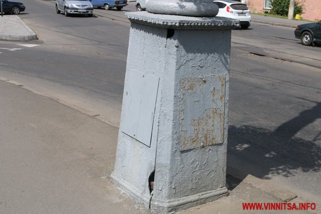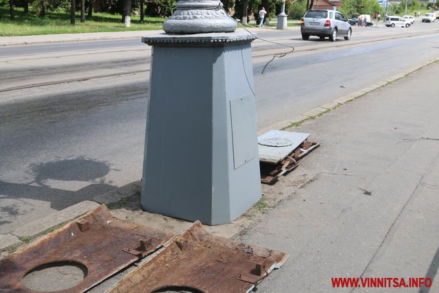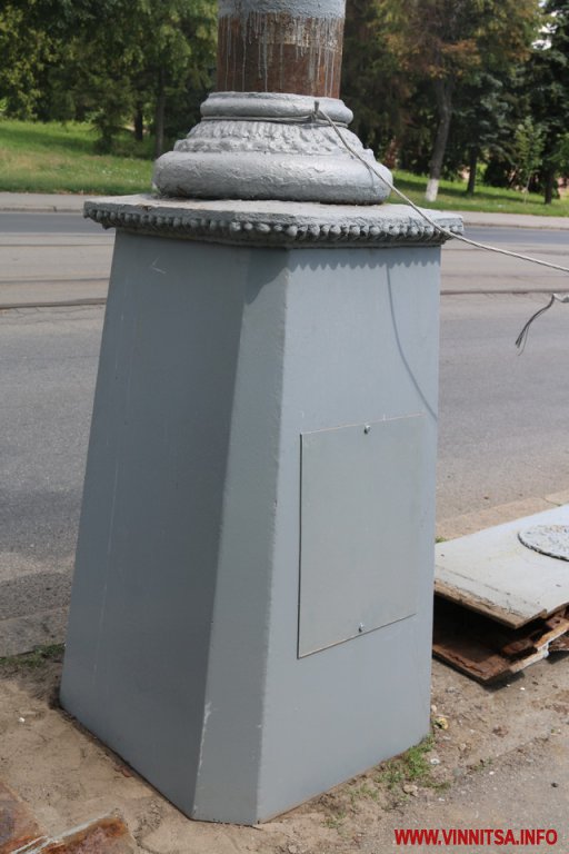 1 липня у Вінниці по вулиці Соборній працівники комунального підприємства «Міськсвітло» замінюють старі чавунні основи електроопор, які є своєрідними щитками.