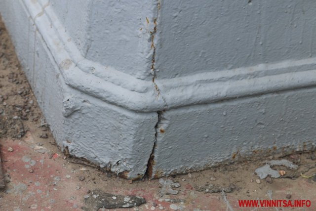 Старий чавунний «декор» стовпів з часом зіпсувався, утворилися незначні дірки, іржа, деякі попсували вандали.
