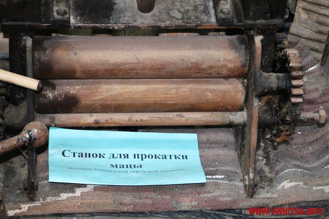 На етажерці виставлені предмети ритуалу єврейської релігії, молитовники. Серед унікальних предметів музею - кружка для омовіння рук, ручки до неї виготовлені з гільзи снаряду, прикраса «кетер Тора». Найважчим експонатом є древній станок прокатки маци, що потрапив у музей з Бершаді.