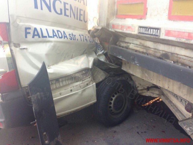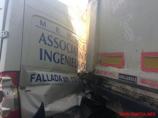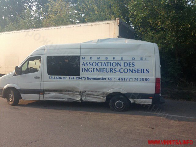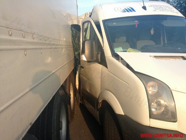 «Водій «Mitsubishi» житель міста Вінниці не впорався з керуванням і виїхав на зустрічну смугу руху, де зіткнувся з попутним автомобілем «Skoda». В подальшому водій «Mitsubishi» зіткнувся з «Volkswagen». Після чого мікроавтобус відкинуло на причіп автомобіля «Renault»», - повідомив В. Кобзар.
