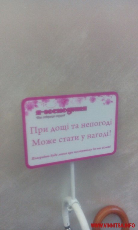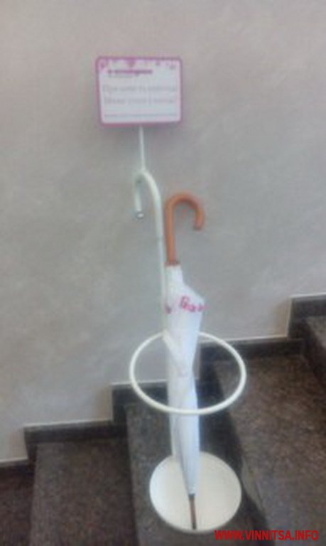 На кошику для парасольок написано: При дощі та непогоді може стати у нагоді! Поверніть будь ласка при наступному до нас візиті.