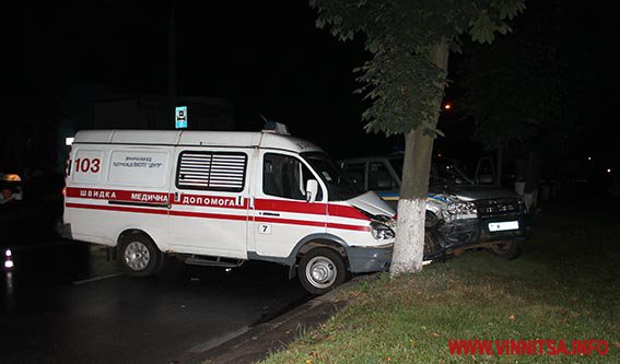 24-рчний водій автомобіля «KIA Sportage», виїжджаючи з території Вінницької міської клінічної лікарні швидкої медичної допомоги, допустив зіткнення зі службовим міліцейським автомобілем «УАЗ Патріот», який їхав по головній дорозі в напрямку вулиці Гонти. Від потужного удару міліцейський автомобіль «викинуло» на мугу зустрічного руху, де він зіткнувся з каретою швидкої допомоги.
