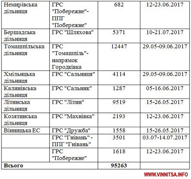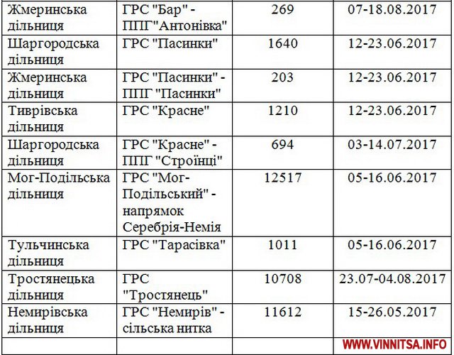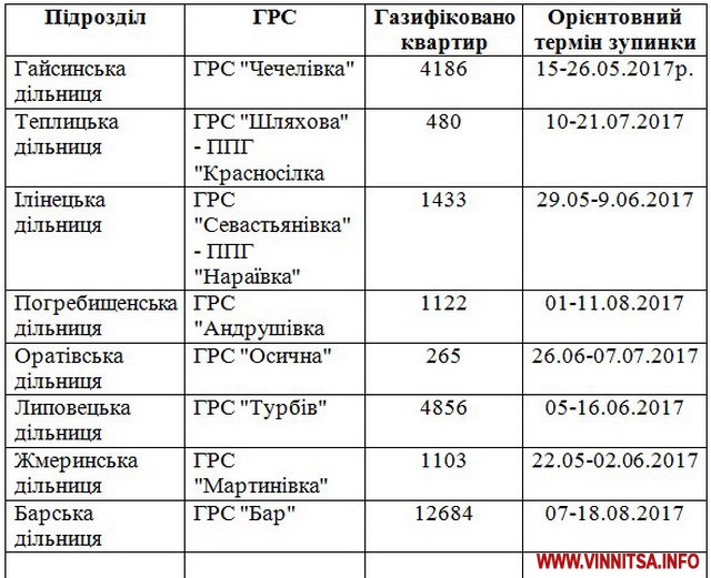 У Вінницькій області затвердили графік зупинки газорозподільних станцій (ГРС) на 2017 рік. В оселях подолян тимчасово не буде «блакитного» палива через проведення ремонтно-профілактичних робіт. Такі дії дозволять зменшити обсяги втрат природного газу.