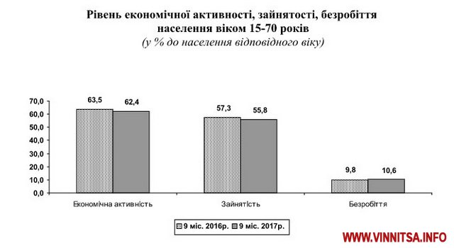 «Чисельність зайнятого населення Вінницької області віком 15-70 років за 9 місяців 2017 року зменшилась порівняно з аналогічним періодом 2016 року на 3,0% і становила 646,3 тис. осіб. Рівень зайнятості населення зменшився з 57,3% до 55,8% (середній по Україні – 56,3%). Рівень безробіття економічно активного населення, визначений за методологією Міжнародної організації праці, зріс з 9,8% до 10,6% (середній по Україні – 9,4%), у т.ч. населення працездатного віку – з 10,2% до 11,0% (середній по Україні – 9,7%).