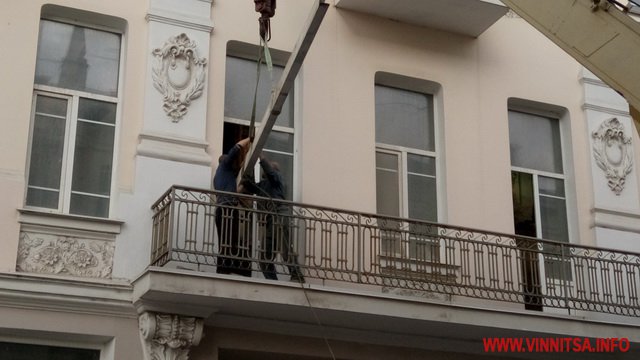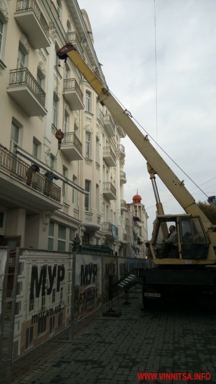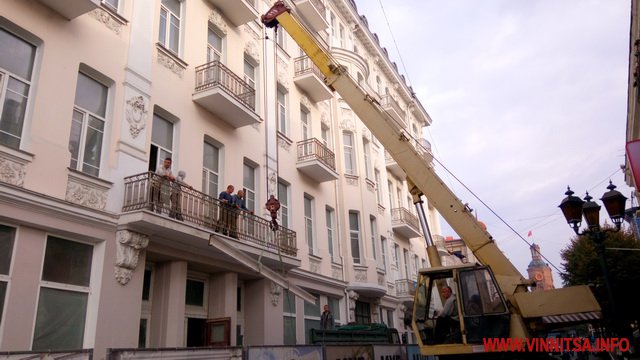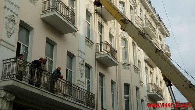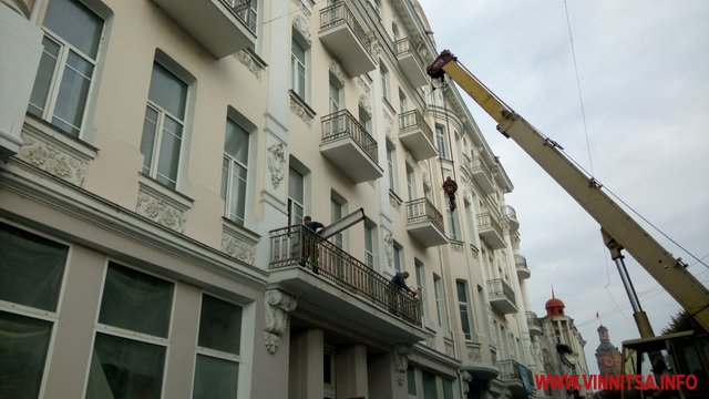 4 жовтня у Вінниці тривають роботи з реставрації столітньої пам’ятки архітектури – готелю «Савой». Сьогодні вранці біля приміщення працює вантажний кран. За допомогою техніки в будівлю через балкон доставляють залізні балки.