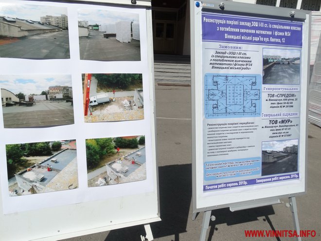 У вінницькій загальноосвітній школі №34 реконструюють дах. Наразі там виконано демонтаж рулонного покриття покрівлі, ремонт цегляної кладки вентиляційних каналів, штукатурку стін в місцях примикань покрівлі, вже завезено і матеріали для утеплення. До початку навчального року ремонт покрівлі планується завершити.