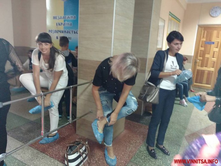 Ввечері 12 вересня у холі вінницької школи №3 близько півтисячі людей. Це батьки учнів, які пройшли на перші збори нового навчального року. Перед тим, як розійтися по класах, поверх взуття вдягають бахіли або пакети. Це загальне положення для всіх. Таким чином намагаються берегти чистоту та підлогу, яка вистелена з паркету.