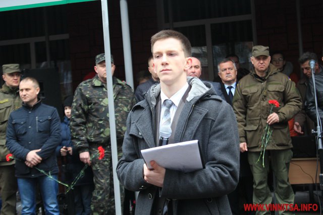 «Сьогодні я звертаюся до вас, з великим болем в серці, болем вчителя, який пережив свого учня. Я приношу вибачення перед мамою, батьком, дружиною і дітьми Саші, бо знаю як це рости без батька, це абсолютно не правильно, що мати повинна стояти під час відкриття меморіальної дошки свого сина. Я єдине що прошу Господа Бога миру в Україні, злагоди в Україні, спокою в Україні. Слава Україні! »,- сказав директор.