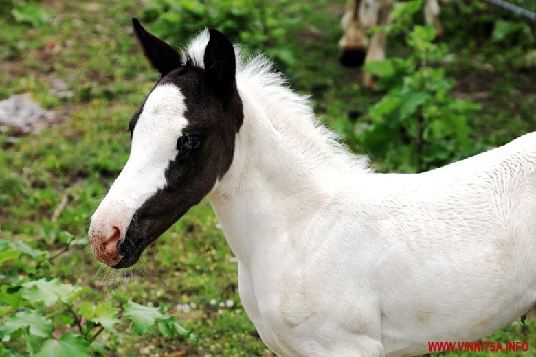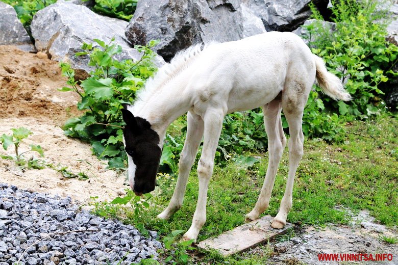 На початку тижня кобила Варта, яку привезли з Гуцульщини, народила лоша. Воно ще зовсім маленьке. Має біле забарвлення тулубу і чорну плямку на морді. Блакитні очі.