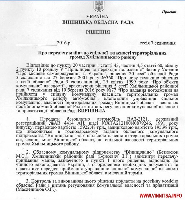 Рішенням передбачено безоплатно передати автомобіль «ВАЗ 2121» 1994 року випуску, який знаходиться у господарському віданні обласного комунального підприємства «Вінницякіно» до спільної власності територіальних громад Хмільницького району.