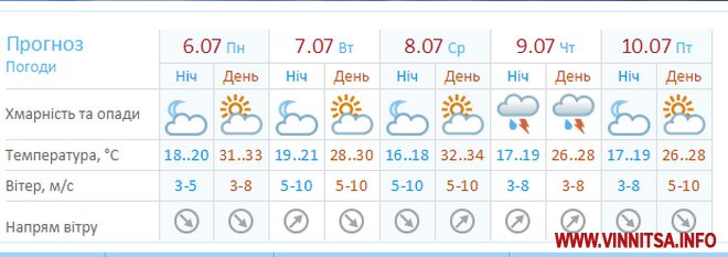 Сезон дощів нарешті закінчився, спекотне літо знову у Вінниці. Найближчі 10 днів термометри покажуть 16-17 градусів тепла вночі і до 34 вдень. Щоправда, у четвер Гідрометцентр прогнозує грозу, але на температуру вона, очевидно, мало вплине, адже стовпчики термометрів піднімуться до 28 вище позначки «плюс».