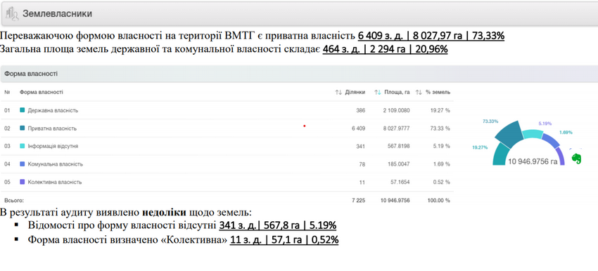 У ході аудиту, була зібрана інформація про власника, орендаря, строки дії оренди, площі земельних ділянок, аналізу про наявність розбіжностей між різними реєстрами, цільове призначення та нормативно грошову оцінку.