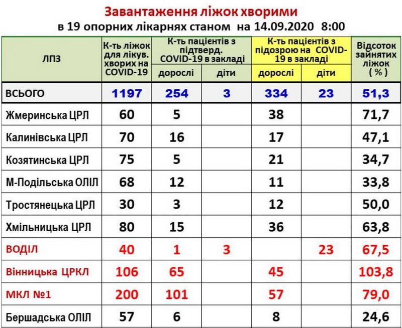 Станом на 14 вересня на Вінниччині в 19 опорних лікарнях розгорнуто 1197 ліжок для лікування хворих на коронавірусну інфекцію. Відсоток зайнятих ліжок становить 51,3. Вінницька ЦРЛ перевантажена – 103% зайнятих ліжок.