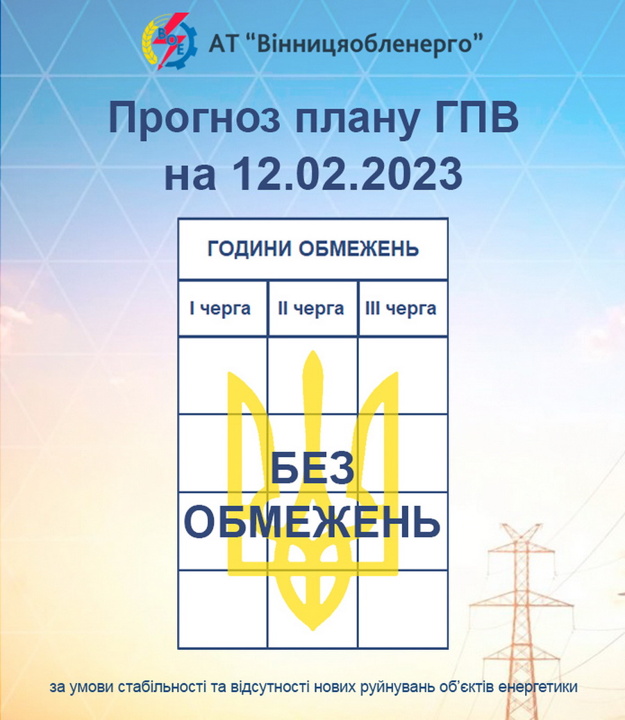 НЕК «Укренерго» на 12 лютого не задіяло обмеження електропостачання для Вінницької області.