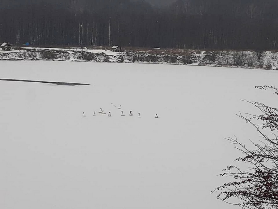«До пожежно-рятувальної частини м.Гнівань надійшло повідомлення про те, що в с.Могилівка на Голубому озері примерзли лебеді. Прибувши на місце виклику рятувальники спробували підібратися до птахів, які були посередні озера, але як виявилося, птахи просто сиділи на кризі біля ополонки. Побачивши, що рятувальники підбираються ближче, лебеді злякалися та пішли, тому рятувати їх не довелося.