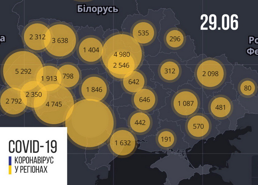 Станом на ранок 29 червня всього в Україні 43 628 лабораторно підтверджених випадків COVID-19, з них 1147 летальних, 19 027 пацієнтів одужало.