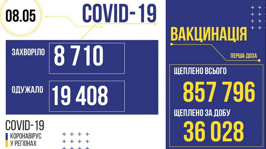Загалом в Україні за добу одужали 19408 людини. Захворіло - 8 710. Померли - 370. Щеплено — 36 028, а загалом проведено 857796 вакцинації.