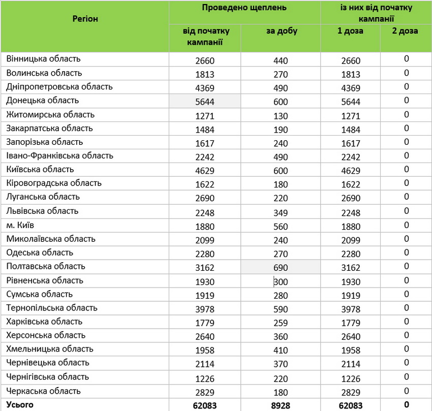 Розподіл проведених щеплень за регіонами за минулу добу виглядає так: