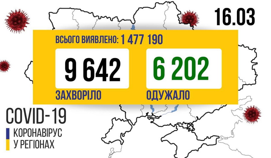 В Україні за минулу добу всього зафіксовано 9 642 випадків інфікувань. Одужали минулої доби 6 202 людини в Україні. Померли – 264 особи.