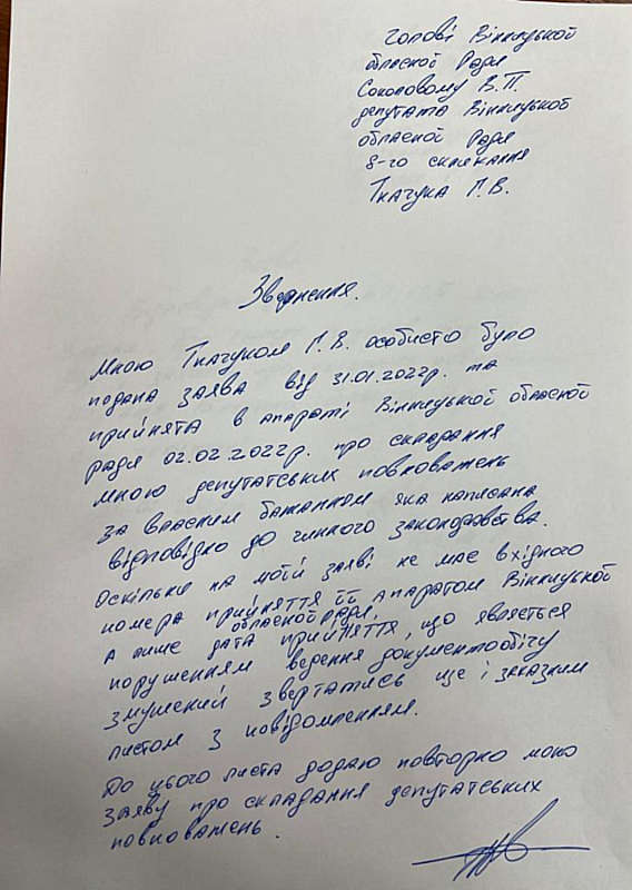 На сайті Вінницької облради опублікували проект рішення про дострокове припинення повноважень депутата Вінницької обласної Ради 8 скликання.