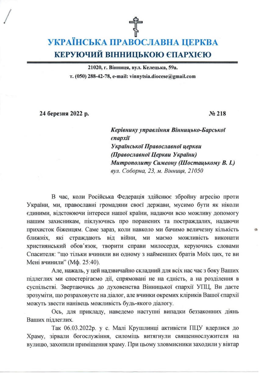 Мною було розглянуто Ваш лист за №218 від 24 березня 2022 року. Перш за все, я погоджуюся з Вами, що у воєнний час, коли всі громадяни України у єдиному патріотичному пориві встали на захист Батьківщини і наближають нашу перемогу на фронті і в тилу, важливою є участь у цій спільній справі православних вірян усіх юрисдикцій. Можливо хтось у цій ситуації й намагається виправити свої колишні помилки і приділяє значної уваги інформаційному висвітленню своєї благодійної і миротворчої діяльності, але таких не так вже й багато і, переважно, вони належать до церковного керівництва, в той час, як прості священники і віряни роблять свою справу за велінням серця, за покликом душі, пліч о пліч з усім народом.