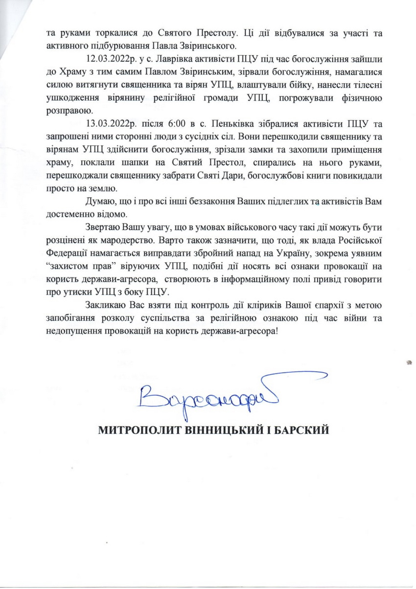 У листі Ви згадуєте про декілька випадків фактичної зміни церковної юрисдикції, які відбулися на Вінниччині з початку війни. Насправді їх набагато більше, і кожний такий випадок – це прояв волі церковного народу, це – ініціатива, яка йде знизу. Вже потім представники тієї чи іншої релігійної громади зверталися до священників Православної Церкви України, щоби вони не залишили їх без духовної опіки, адже Ваші служителі відмовилися підтримати свою паству. Сьогодні Ваші клірики бідкаються, що залишилися без храму і без пастви, але кожний, хто знає ситуацію зсередини, розуміє, що це маніпуляція, тому що насправді ці пастирі не залишилися, а залишили свою паству і свої храми.