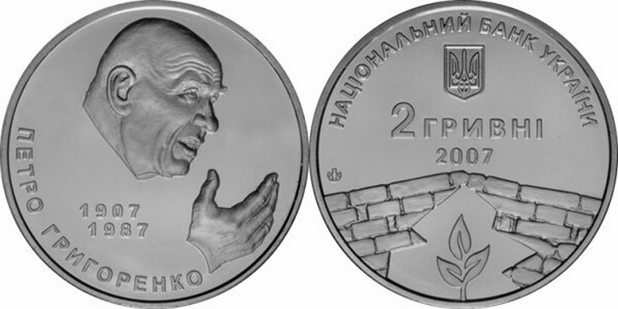 Ювілейну монету «Петро Григоренко» ведено в обіг Національним банком України 15 жовтня 2007 року. Маса – 12,8гр., діаметр – 31мм., метал – нейзильбер. На аверсі монети на дзеркальному тлі угорі півколом розміщено напис: «Національний Банк України», нижче – малий Державний Герб України, в центрі номінал – 2 гривні /2007. Внизу зображено символічну композицію – паросток, який пробиває цегляну стіну. Зліва розміщено логотип Монетного двору Національного банку України. На реверсі зображено портрет П.Г. Григоренка та роки життя правозахисника, ліворуч півколом розміщено напис: «Петро Григоренко».