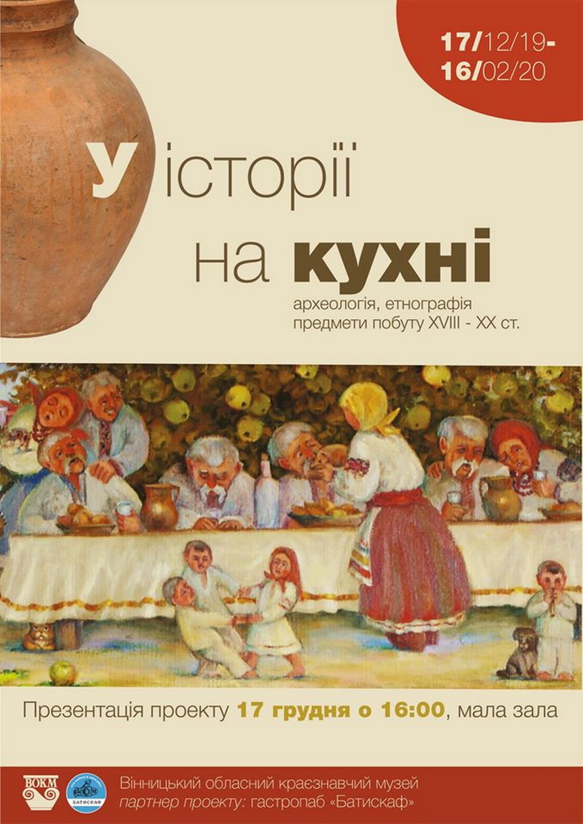 17 грудня у Вінницькому обласному краєзнавчому музеї розпочинають історико-гастрономічний проект. До 16 лютого в приміщення закладу працюватимуть виставки «У історії на кухні» та «Смаки натюрморту», відвідати які можна безкоштовно.