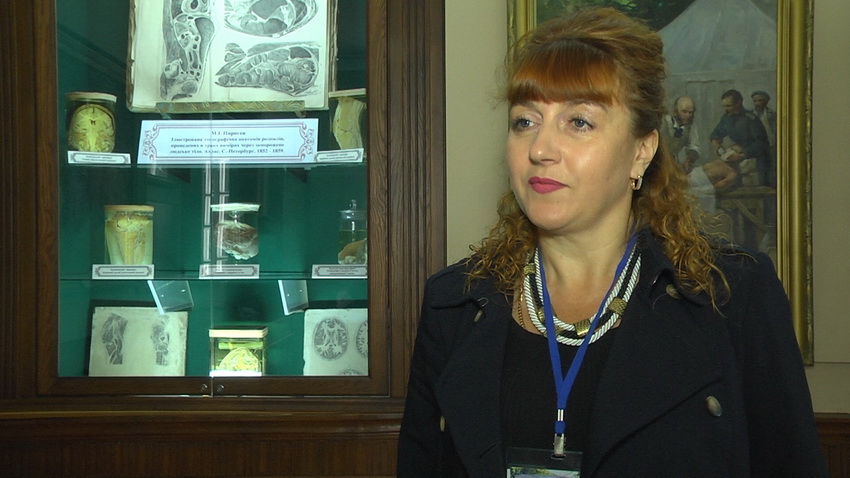 «Це — льодова анатомія. Або, томографічна анатомія розпилу проведеного у трьох вимірах через людське заморожене тіло. Це і є прообраз сучасної комп'ютерної томографії. На стендах представлені оригінальні роботи, які здійснив сам Пирогов. Всього їх було близько тисячі. Але у нас збереглися лише невеличка частина. Та сама цінність у тому, що до них торкалася рука Миколи Івановича. Метою створення от такої роботи, над якою Пирогов працює довгих вісім років, було те, що на цей момент не було рентгенів. Треба було розуміти, як реально розміщуються органи по відношенню один до одного. Під час розтину органи дещо зміщуються. А потрібно розуміти їх реальне розміщення. Чому власне називається льодова анатомія. Він заморожував тіло людини до мінус 15 градусів», - демонструє експозицію екскурсовод.