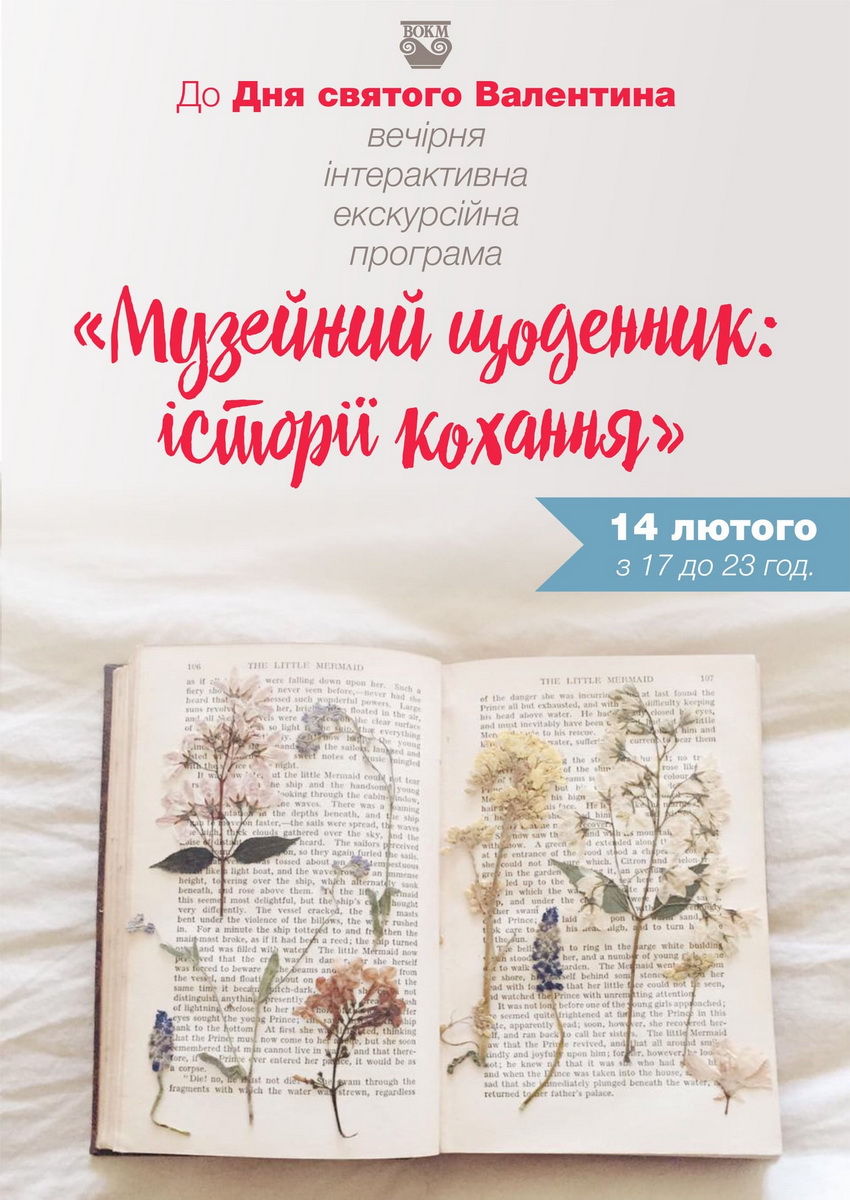 У Вінницькому обласному краєзнавчому музеї запрошують на інтерактивну вечірню екскурсійну програму «Музейний щоденник: історії кохання», які організовують до Дня святого Валентина. Відвідувачам обіцяють «зустріч із Мавкою», сюрпризи від археологів та безліч інформації про афродизіаки. Попередня реєстрація обов’язкова, а кількість місць – обмежена.