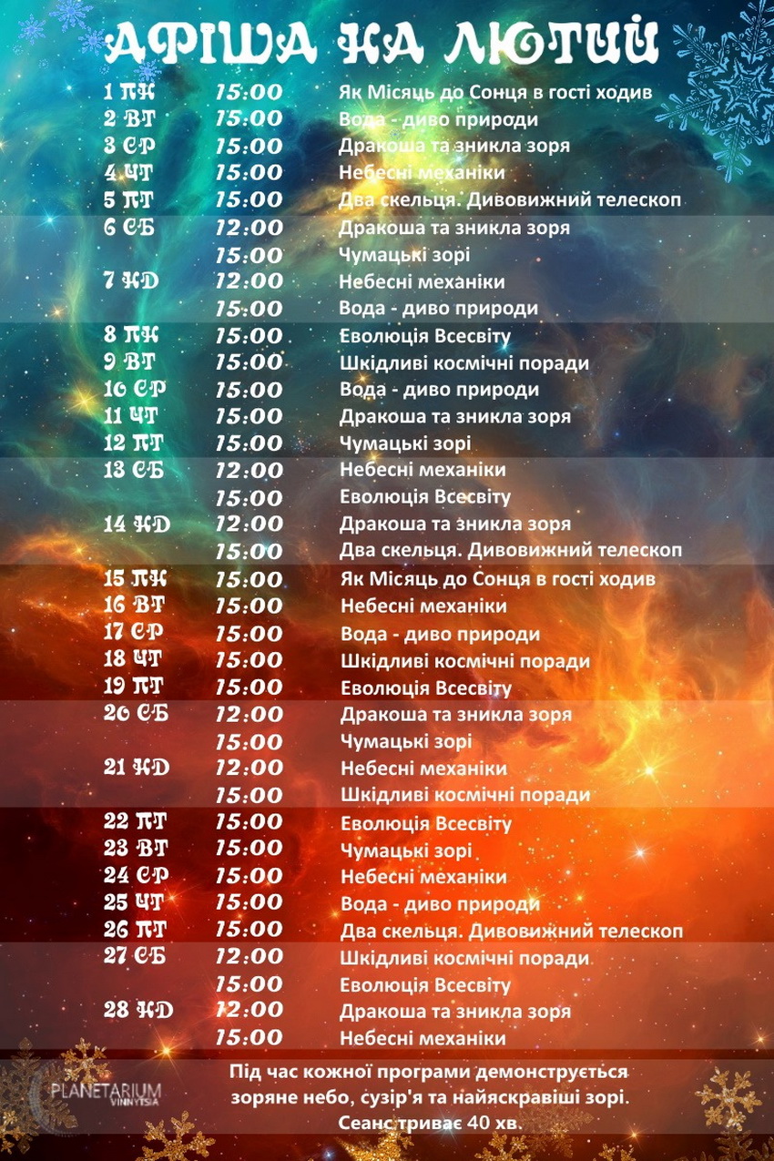 У Вінницькому планетарії опублікували афішу програми на лютий. Під час кожної програми глядачам демонструють зоряне небо, сузір’я та найяскравіші зорі. Тривалість кожної вистави – 40 хвилин.