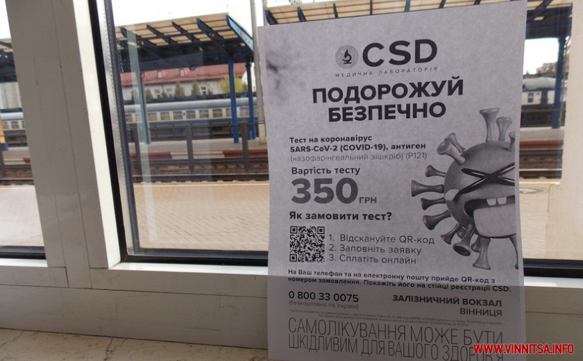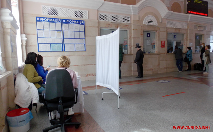 Біля кас на Залізничному вокзалі після опівдня, не багатолюдно. Та чи не кожен звертає увагу на мобільну лабораторію, яку розгорнули біля вікна з видом та колії. Роботу трьох працівниць прикриває біла медична ширма.